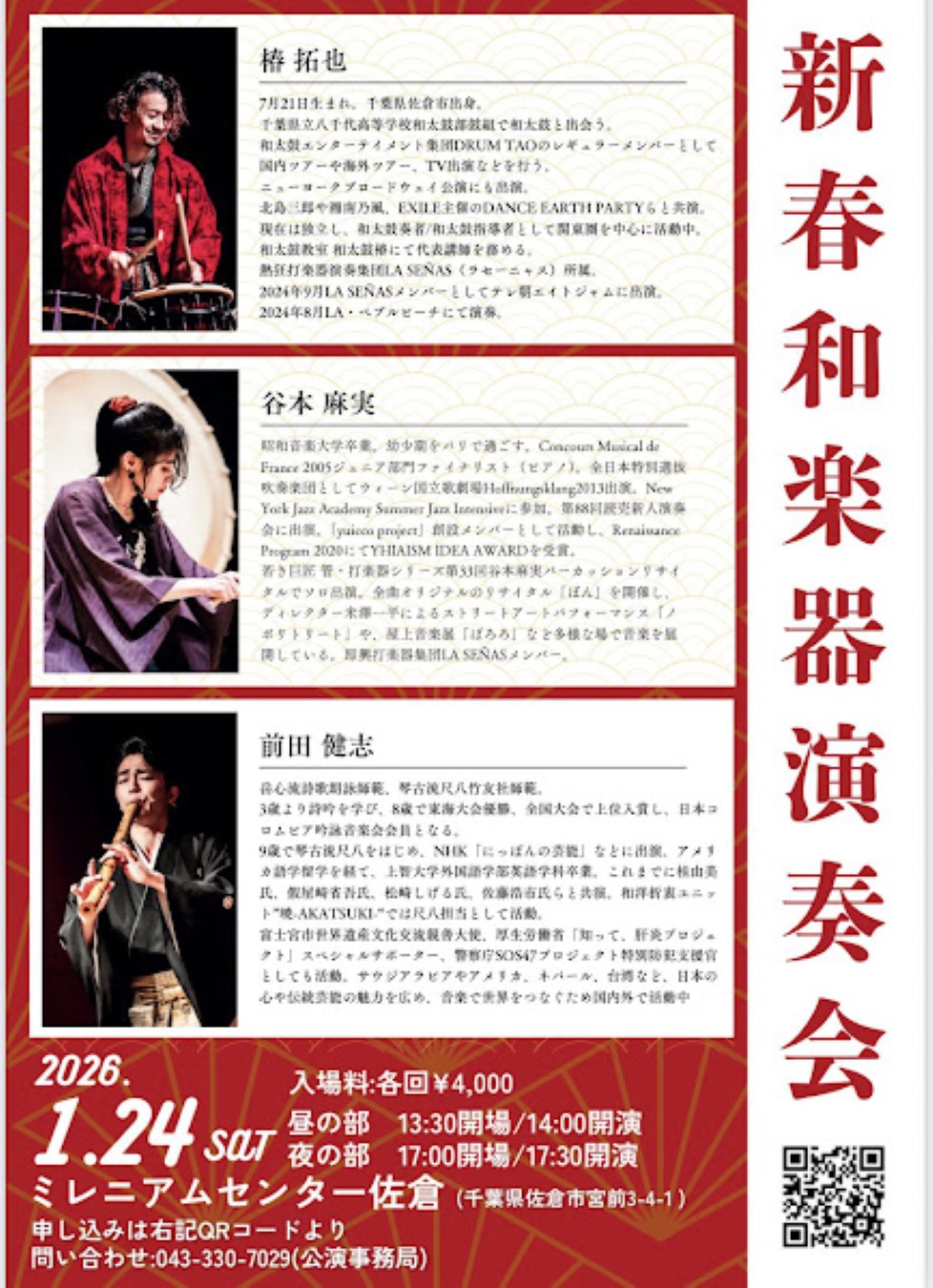 地元佐倉市で今回お2人の和楽器奏者さんと共演! 2026年のオープニングとなる自主企画の演奏会は、椿さんの気合が伝わってきますね!!