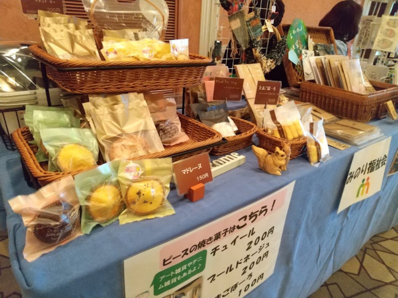 焼き菓子は期間限定「おいものマドレーヌ」や丸くないたまごぼーろが人気です。デニム雑貨や可愛いアート作品も登場します!