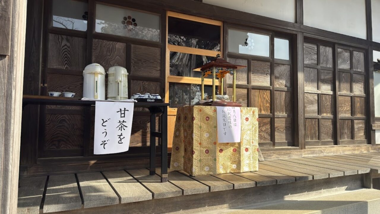5日開催の花祭りマルシェでは、本堂前の花御堂にお参りし、甘茶をいただくことができます。